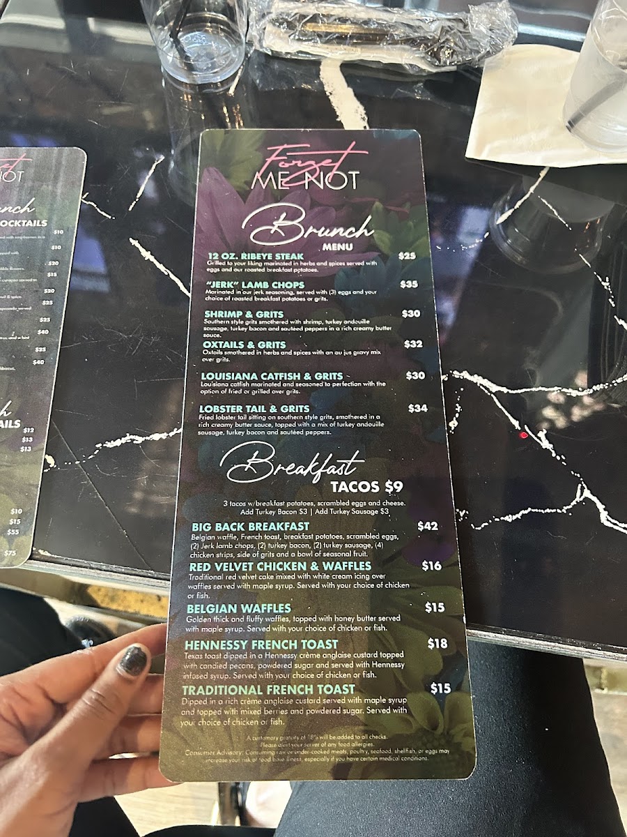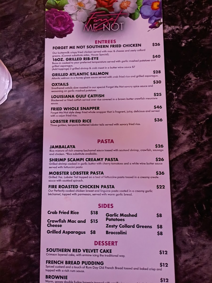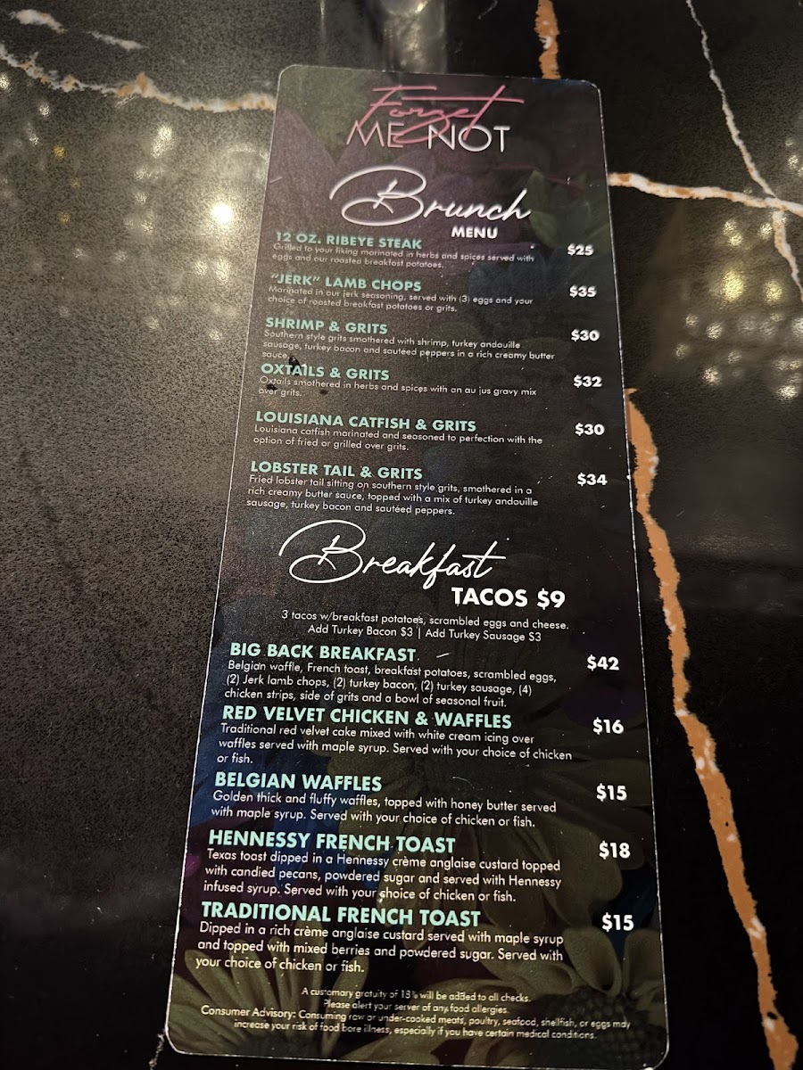- Entrees: The menu includes hearty dishes such as Lollipop Jerk Lamb Chops, Texas Gulf Shrimp, Forget Me Not Gourmet Burger, Shrimp and Grits, and Oxtails.