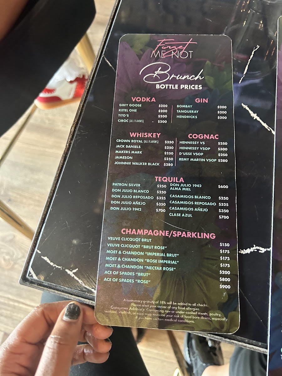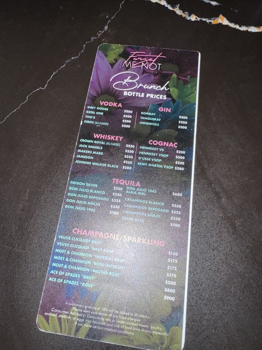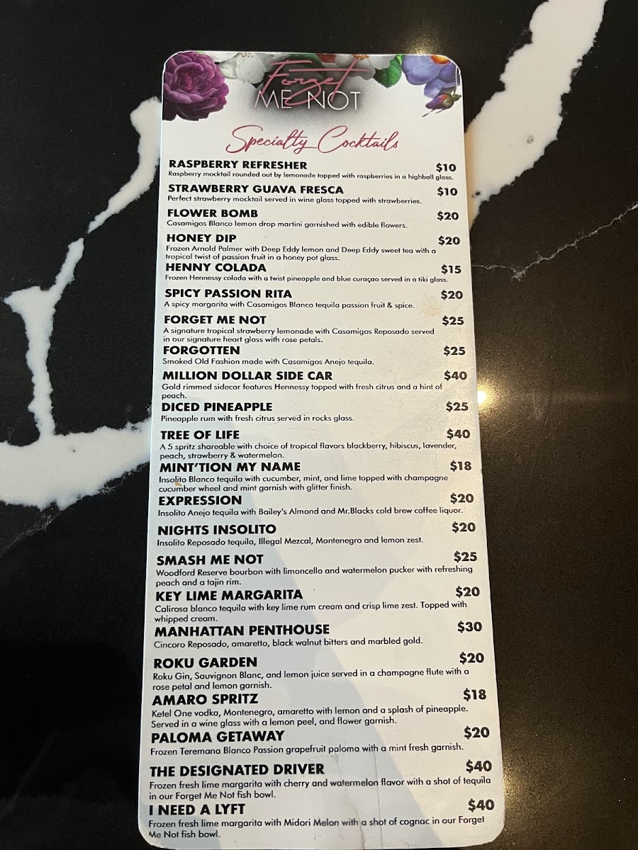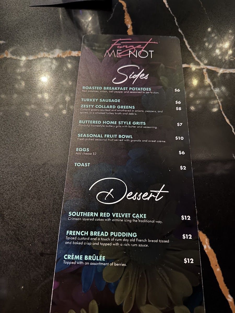 - Entrees: The menu includes hearty dishes such as Lollipop Jerk Lamb Chops, Texas Gulf Shrimp, Forget Me Not Gourmet Burger, Shrimp and Grits, and Oxtails.