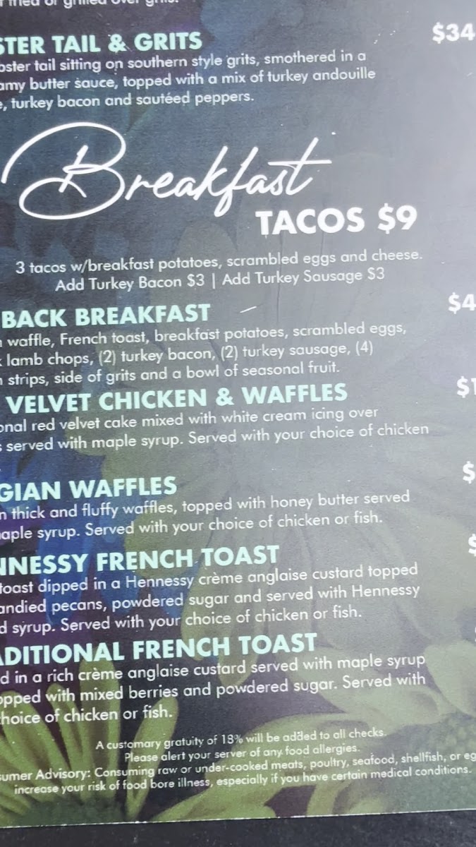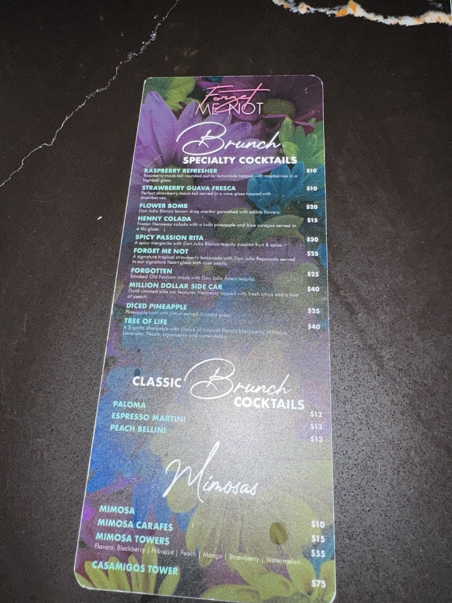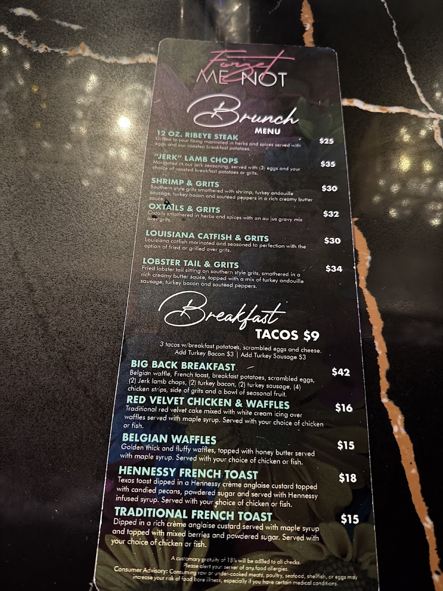 - Brunch and Southern-inspired dishes: Items such as Forget Me Not Southern Fried Chicken, Steak and Eggs, Shrimp Tacos, Seafood Gumbo, and Chicken and Waffles are available for brunch or casual dining.